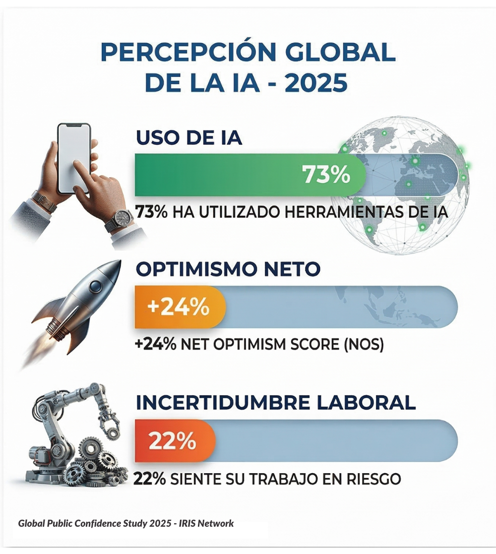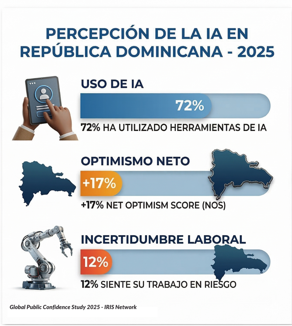 El Global Public Confidence Study 2025, desarrollado por IRIS Network en 20 países y con la participación en República Dominicana de Strategy Solutions Latin America, analizó la relación de la población con la inteligencia artificial a partir de tres dimensiones: uso, optimismo hacia la tecnología y percepción de riesgo sobre el empleo.