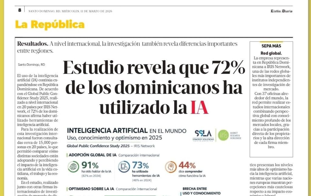 La inteligencia artificial está transformando la forma en que las personas trabajan, consumen información y toman decisiones. Pero más allá del avance tecnológico, surge una pregunta clave: ¿Cómo están percibiendo las personas esta transformación? El Global Public Confidence Study 2025, desarrollado por IRIS Network en 20 países y con la participación en República Dominicana de